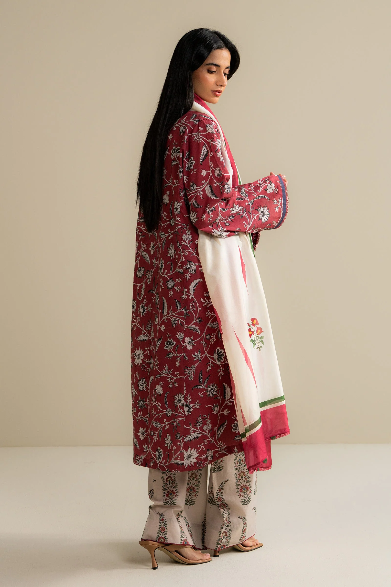 A rosewood shirt with beige trousers and delicate paisley detailing, paired with a flowing silk dupatta—rich tones with timeless grace.