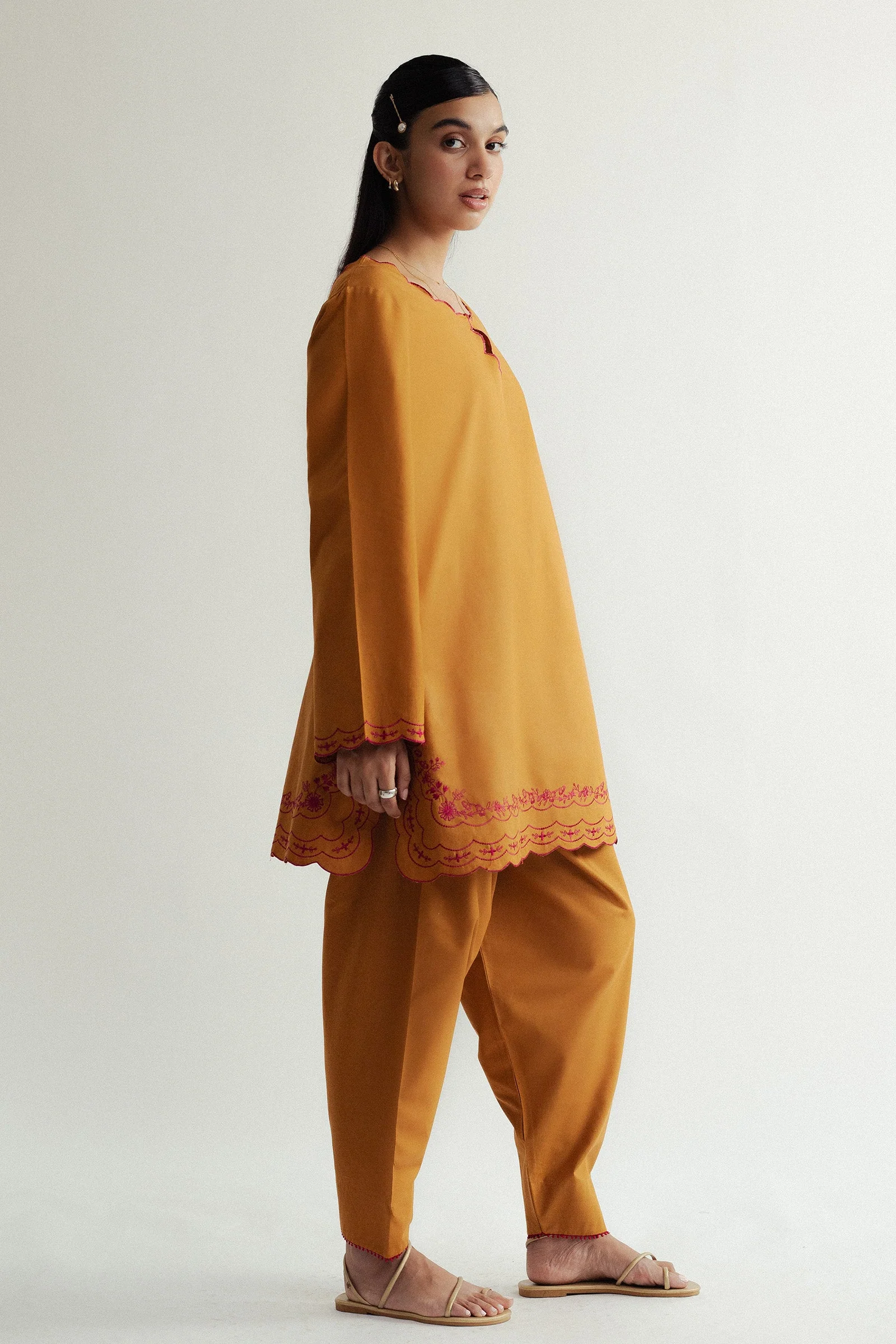A mustard kurta with contrasting scalloped embroidery, styled with a tapered shalwar for a chic everyday look