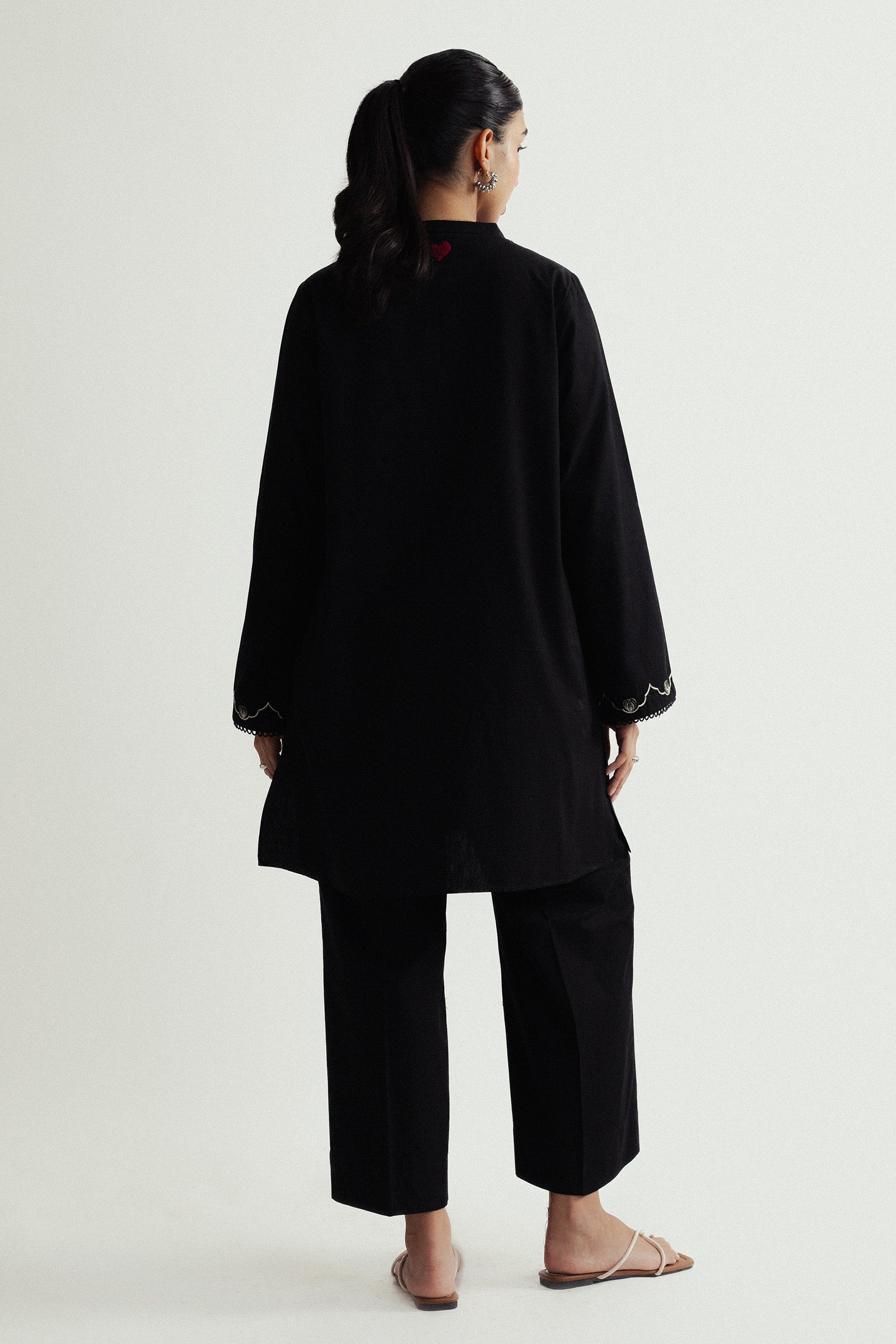 A black shirt and trouser set featuring delicate neckline embroidery with linear detailing, an organza floral patch, and intricately worked sleeves.