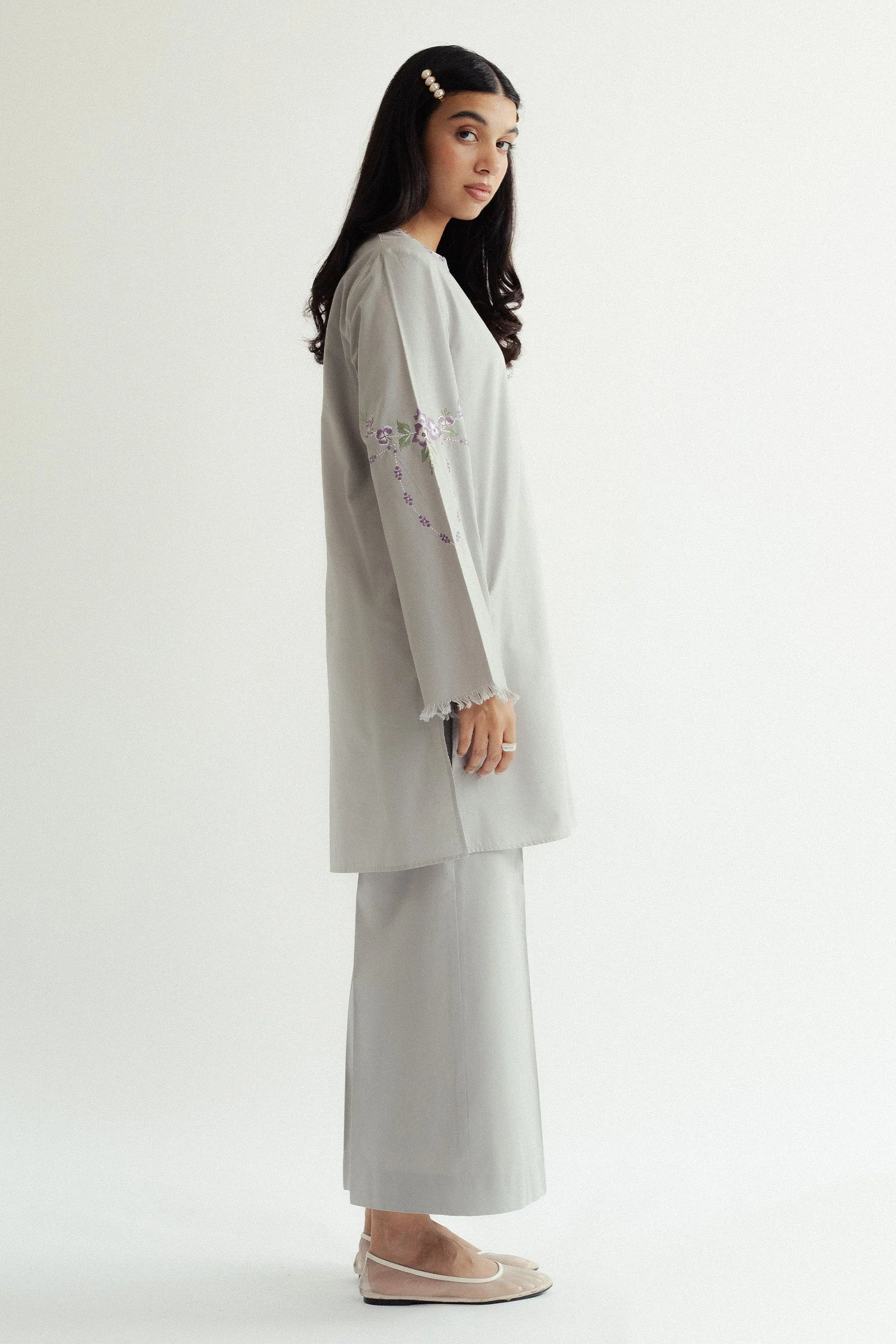 A soft grey shirt paired with wide-hem trousers, highlighted by delicate embroidery along the neckline and sleeves for a subtle yet refined finish.