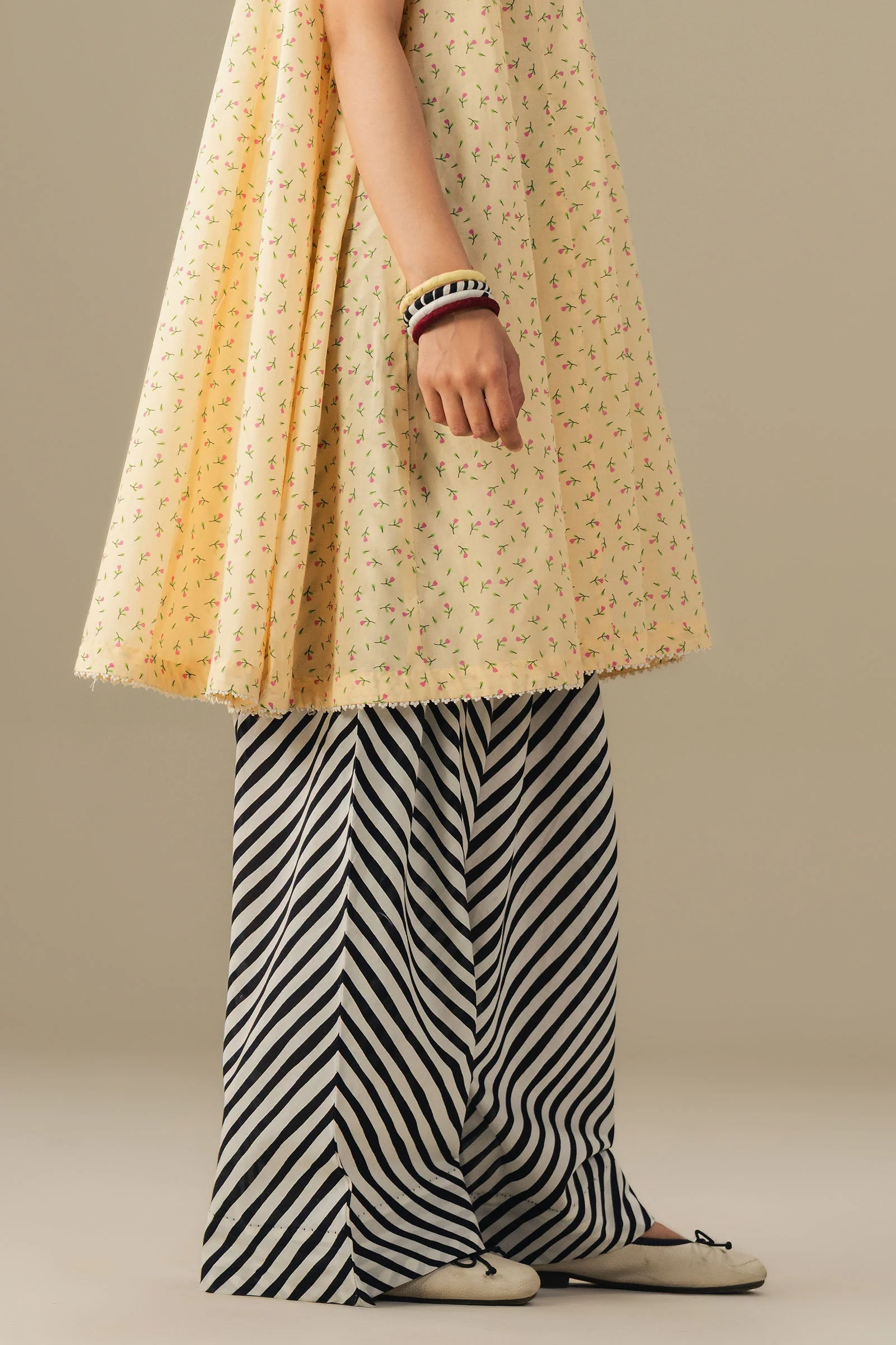 Bright, playful, and full of attitude. This short sleeveless paneled dress brings a sharp, modern silhouette, paired with a contrasting farshi shalwar that adds movement and drama. A bold mix of tradition and now, made to stand out effortlessly.