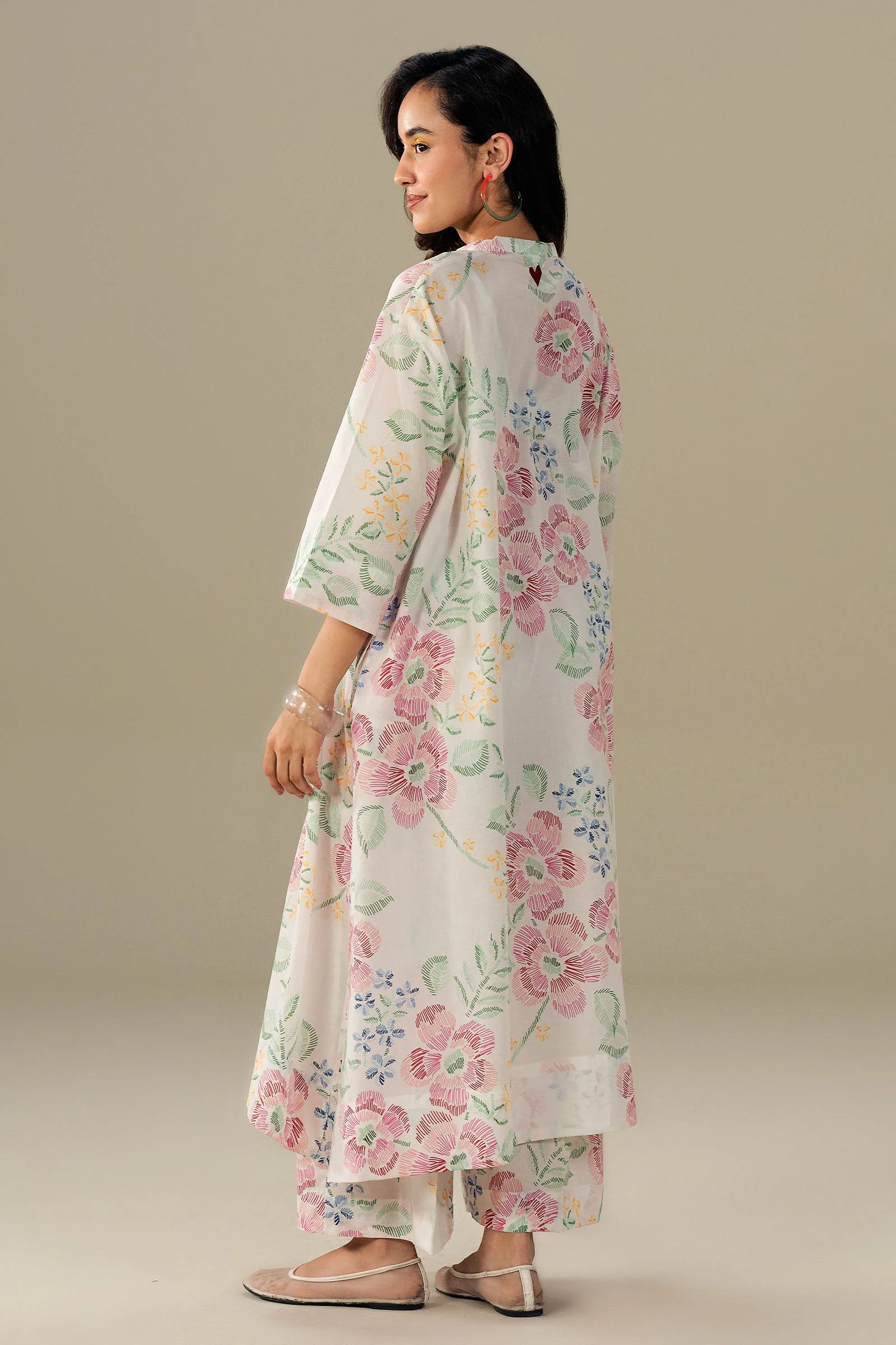 Light, airy, and effortlessly playful. This white floral kurta with short sleeves is paired with cropped wide-hem culottes for a fresh, modern silhouette. Perfect for easy, breezy days with a touch of understated charm.