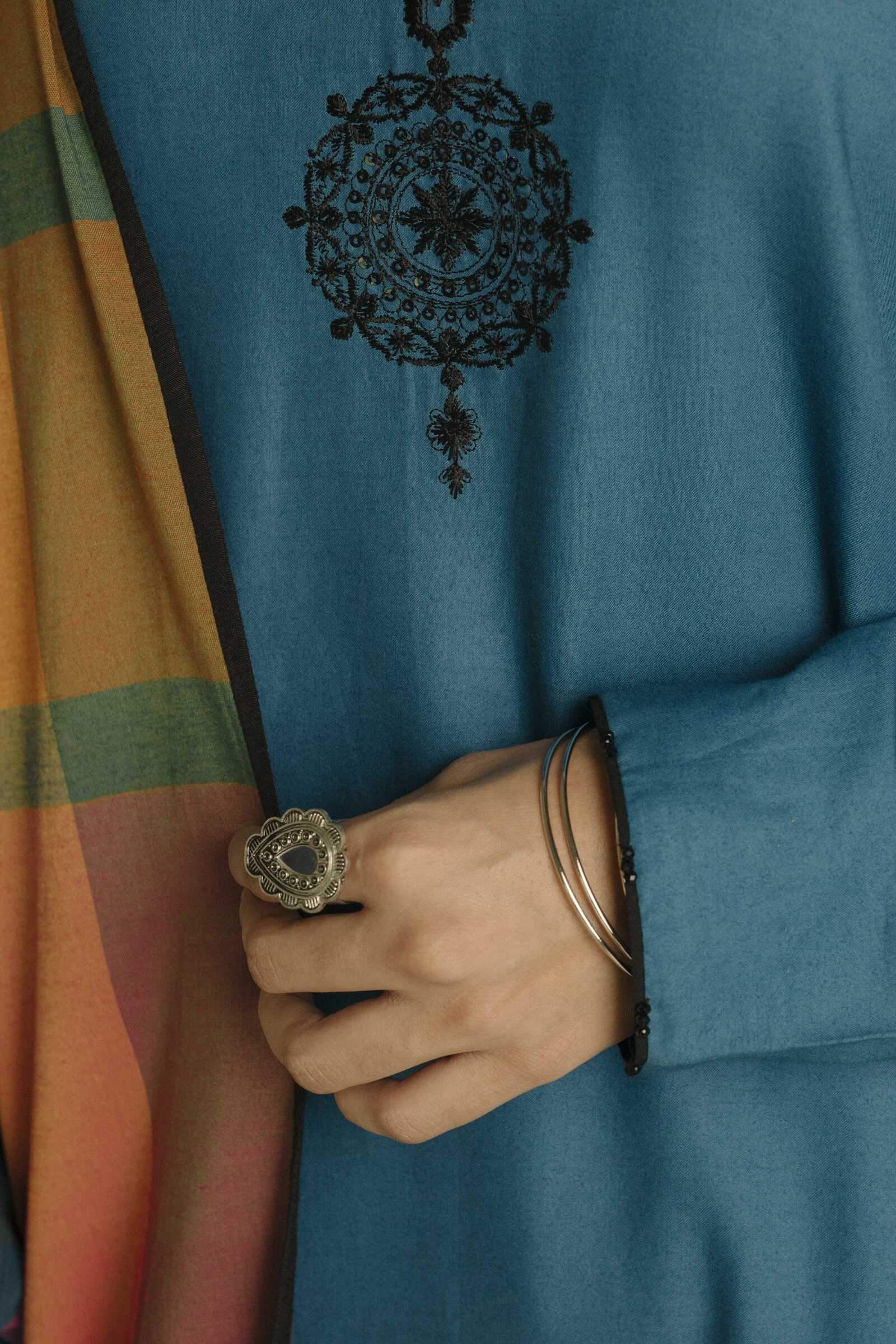 Sea blue regular fit kurta, with contrast sequin embroidery, paired with a tapered shalwar and our customized multi-colored woven dupatta with hand block-print details.