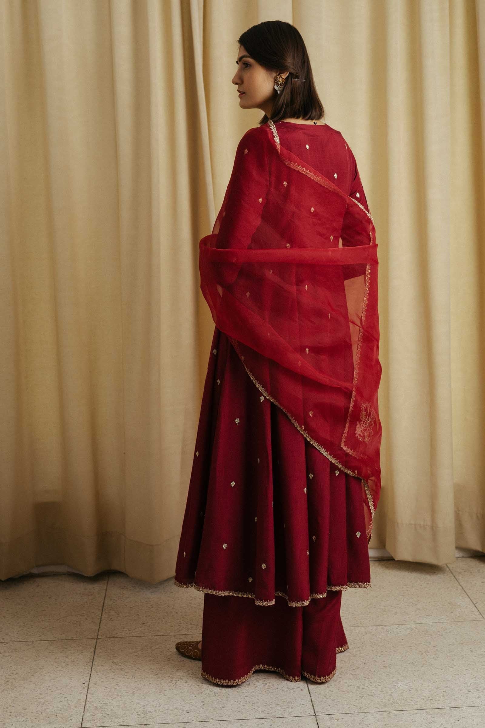 Maroon flared pishwas with intricate embroidery details, paired with sharara pants and an organza dupatta.