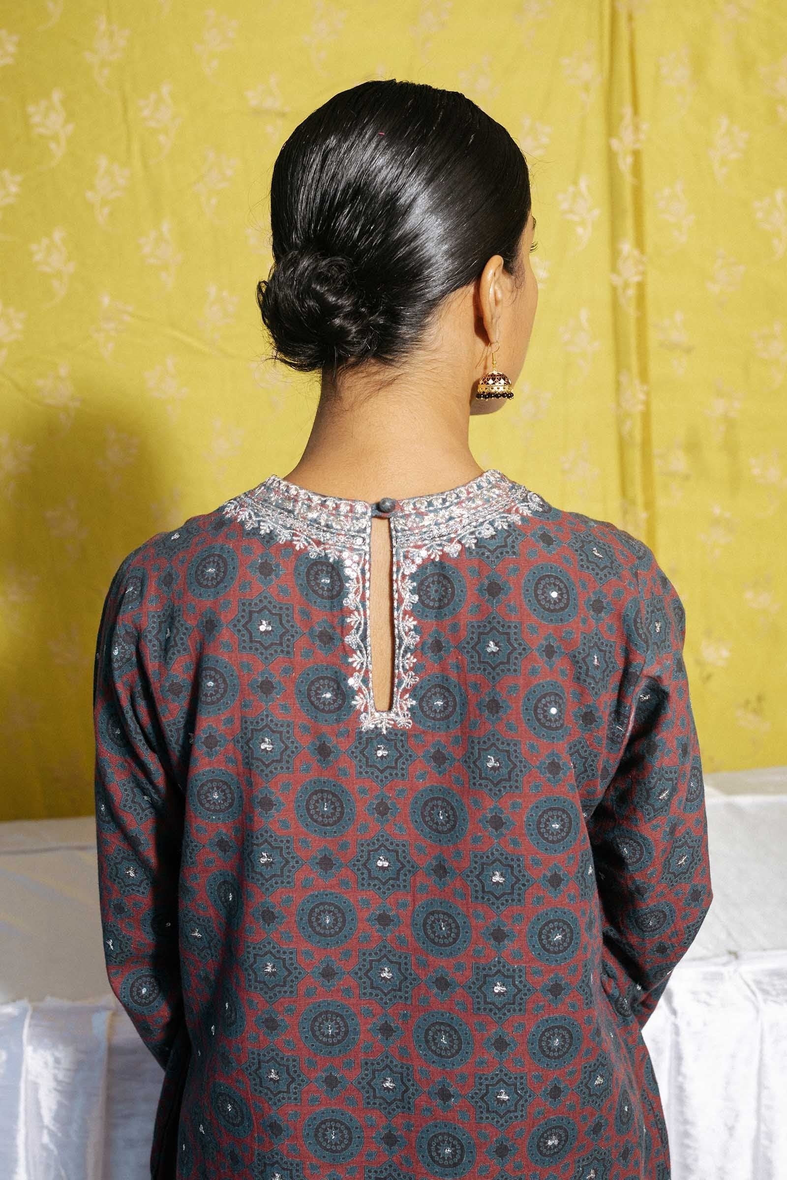 Ajrak printed regular-fit kurta with tilla and sequin embroidered neckline, paired with a black velvet shalwar finished with embroidery details