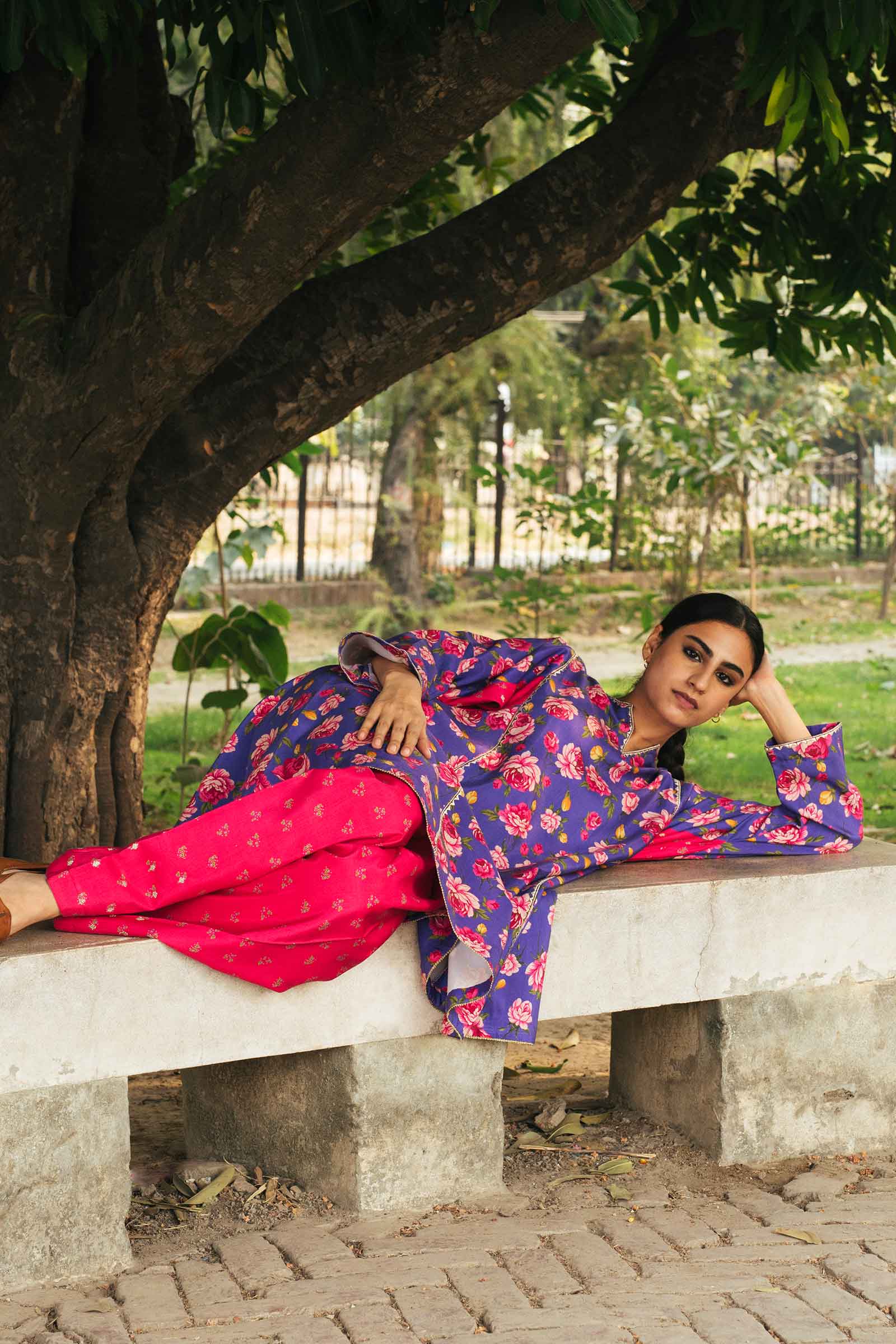 Royal purple paneled, flared kurta stitched and paired with our classic embroidered shocking pink shalwar