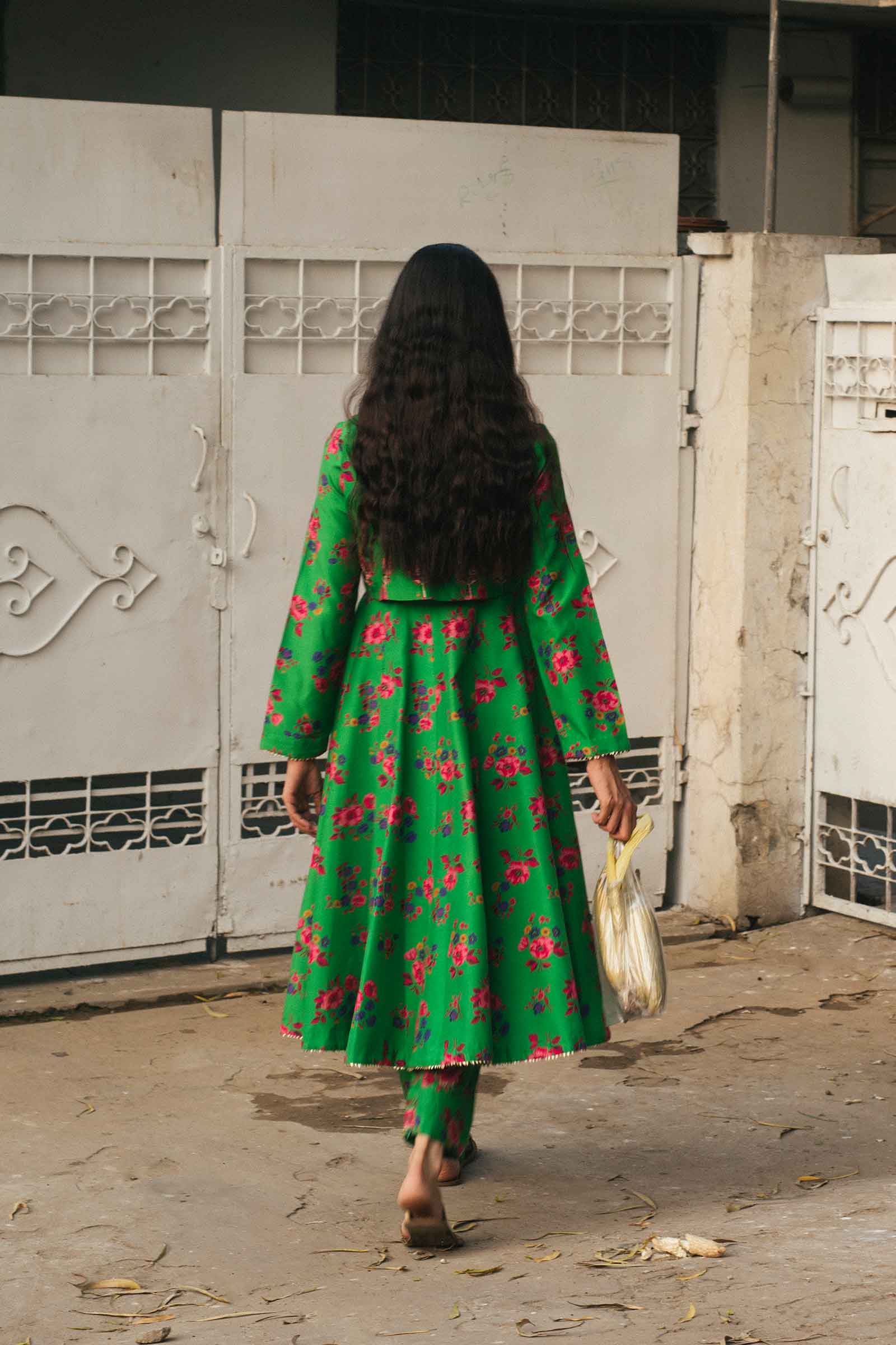 Emerald green flared anarkali, stitched and paired with our signature embroidered short waistcoat and tapered shalwar.