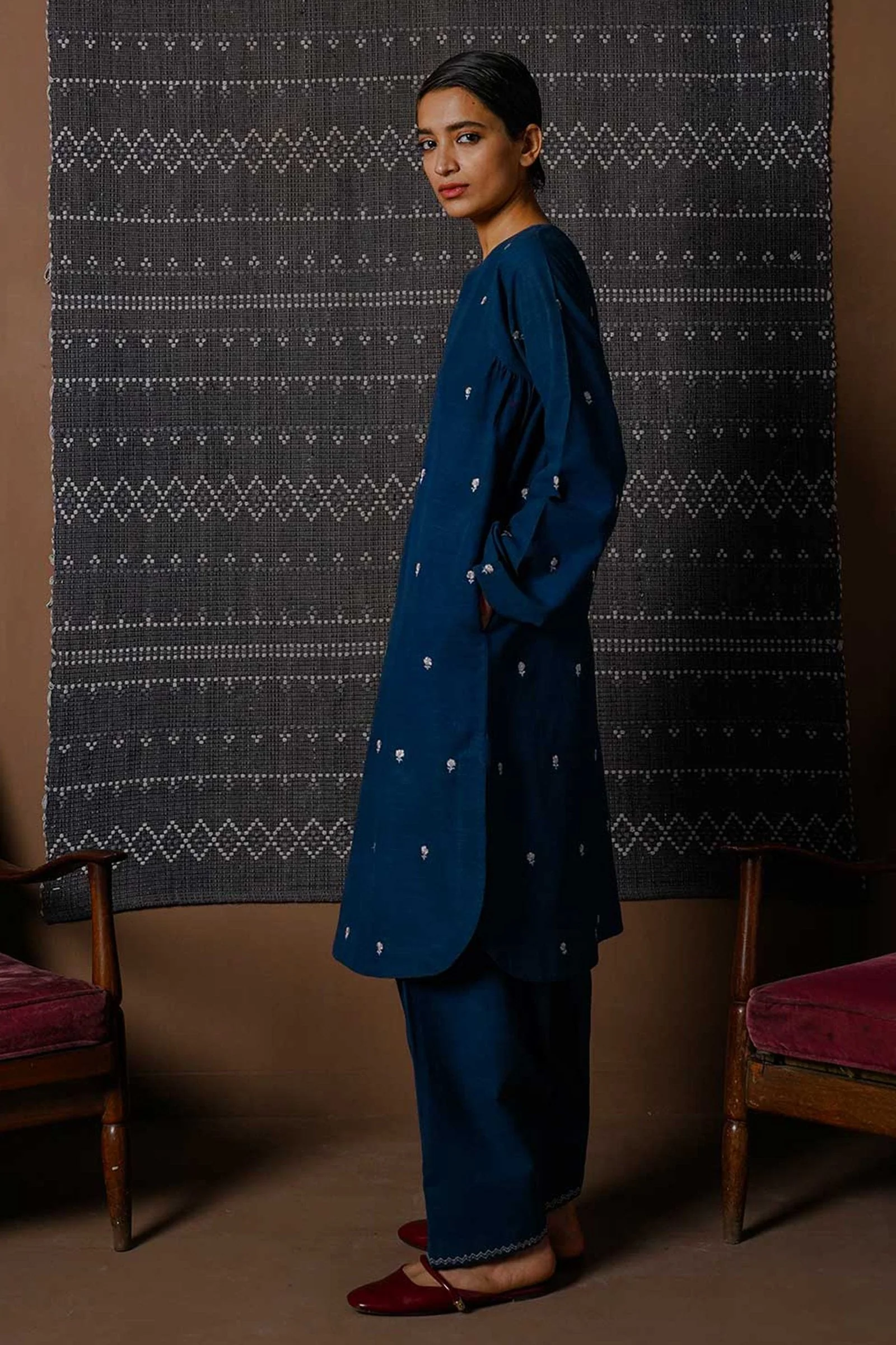 Deep blue flared kurta with embroidery all over, paired with our signature shalwar embroidered at the hem.