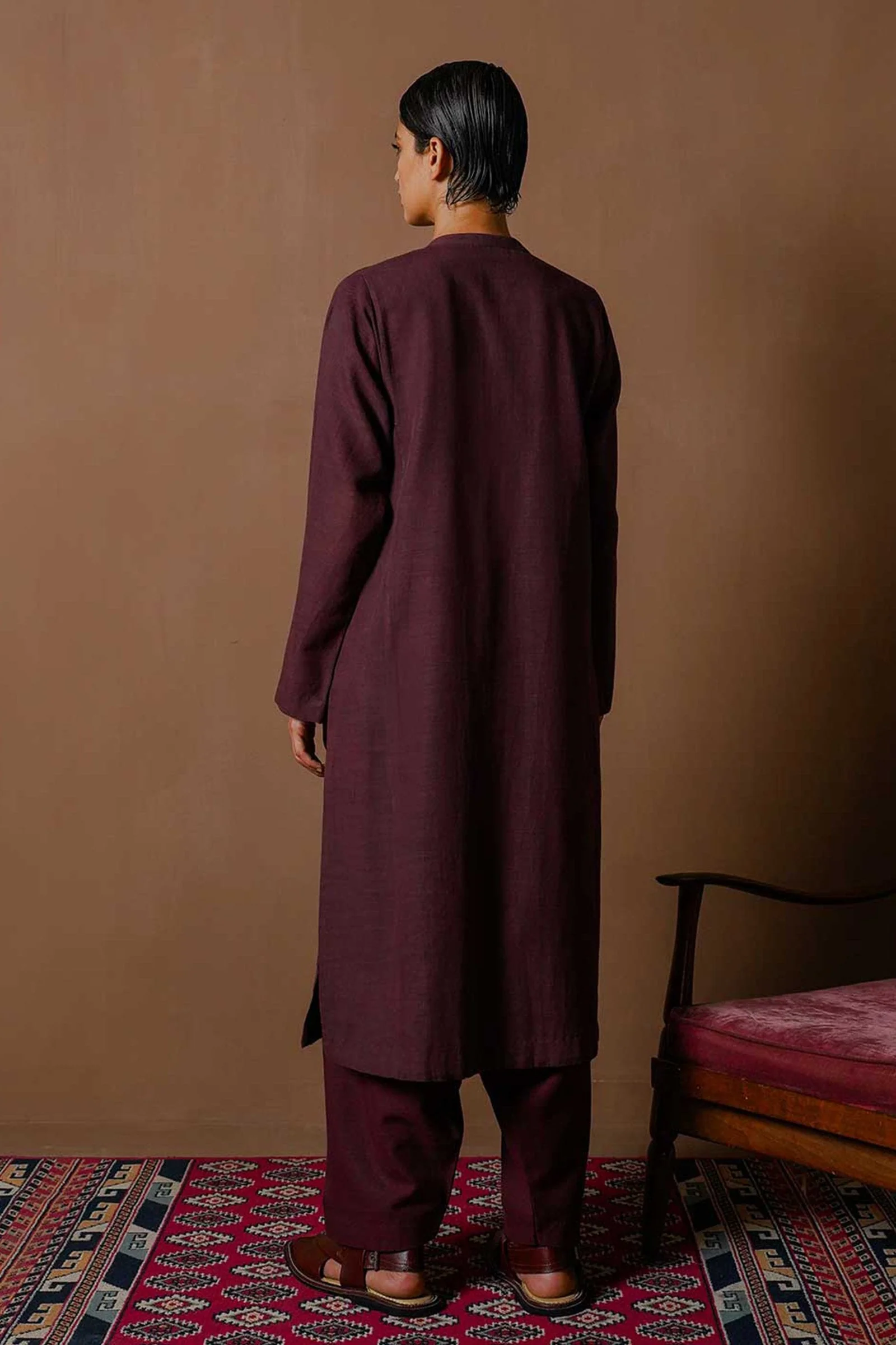 Chocolate brown loose-fit kurta with embroidered side pockets, paired with the same color embroidered shalwar