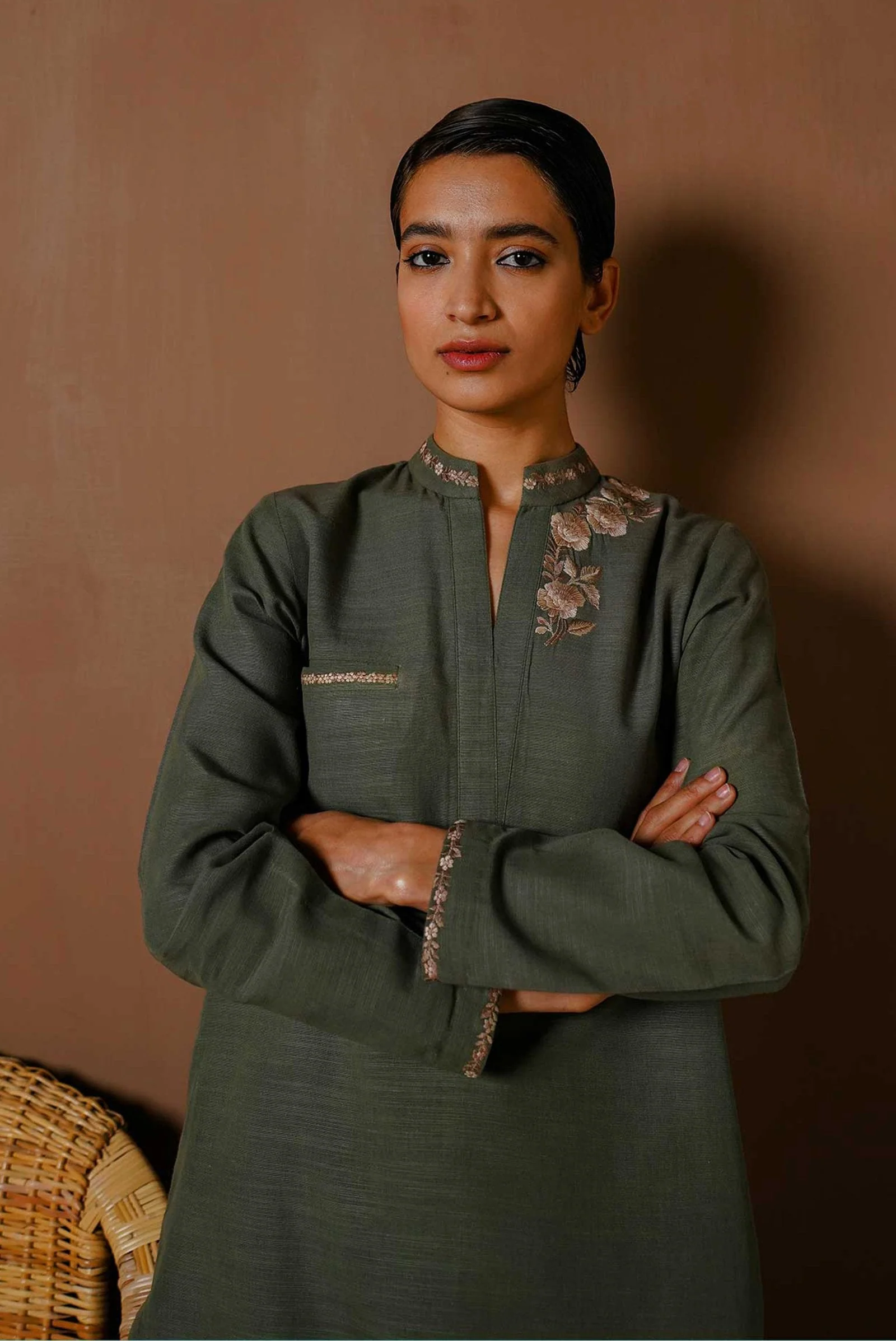 Juniper green straight-fit kurta with embroidery detailing at the welt pocket and neckline, paired with an embroidered shalwar.