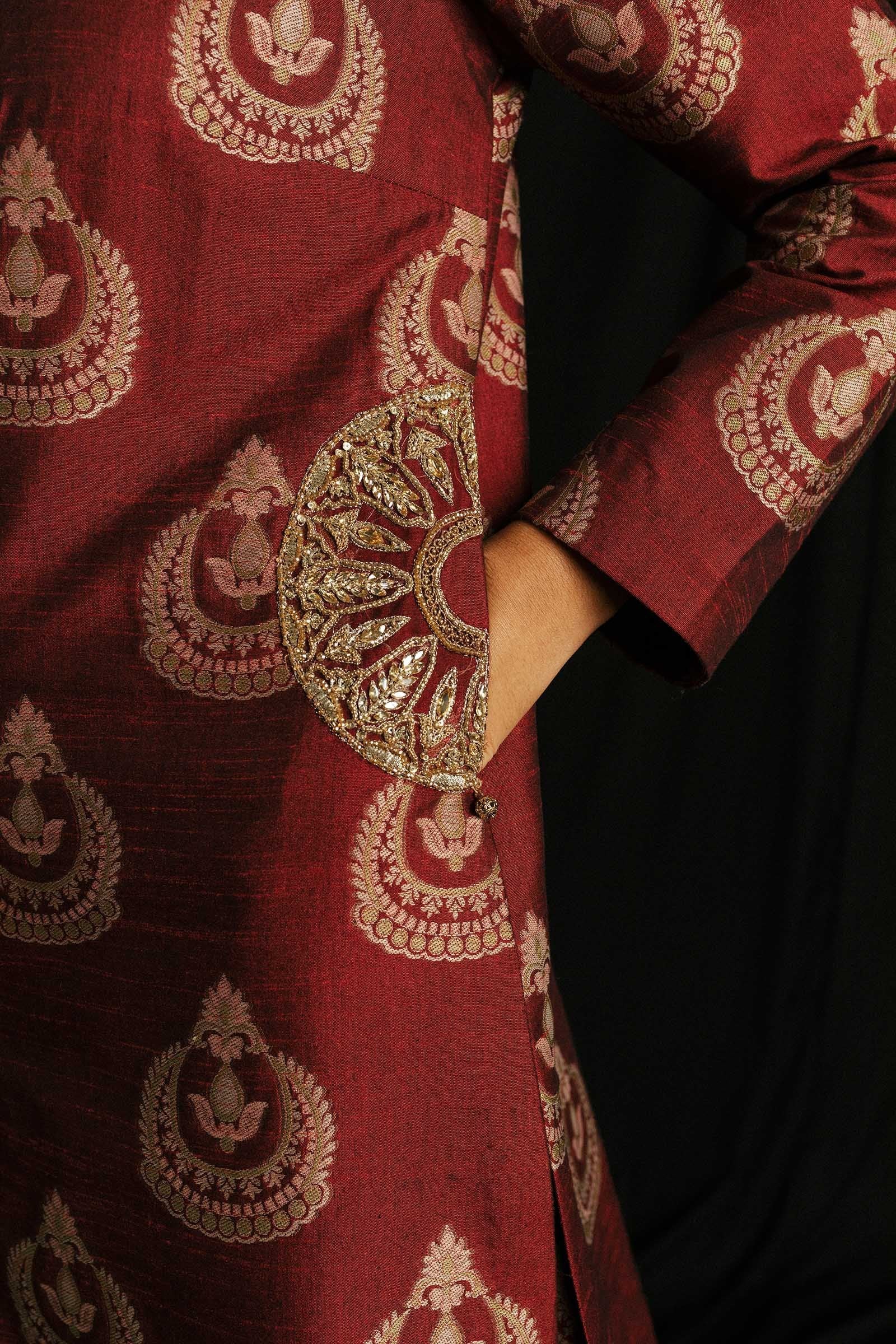 A-line sherwani with hand embroidered pockets with an intricate bael on the neckline paired with an old school flared gharara and organza dupatta with sitara details